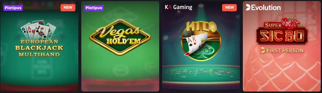 카드 게임(Card Games)은 블랙잭, 포커, 바카라와 같은 전통적인 테이블 게임을 중심으로 제공되며, 카리브 스터드 포커, 드래곤 타이거, 에볼루션 게이밍이 제공하는 다양한 변형 게임과 같은 스페셜 카드 게임도 함께 즐길 수 있습니다. 이러한 게임들은 단순한 운보다는 전략과 확률 계산 같은 스킬이 중요한 요소로 작용합니다.