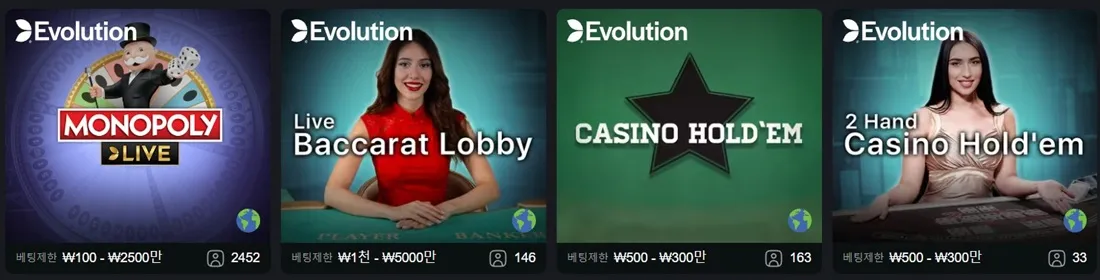 포커(Poker)는 주로 텍사스 홀덤이나 오마하 방식으로 진행되며, 실력을 갖출수록 상대 플레이어의 패턴을 읽고 세밀한 베팅 전략을 세울 수 있어 숙련도에 따라 승률이 향상되는 게임입니다. 또한 포커는 라이브 카지노 및 비디오 포커 형식으로 제공되며, 최근에는 점진적으로 다양한 변형 포커 게임들도 추가되고 있습니다.